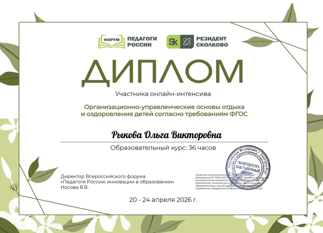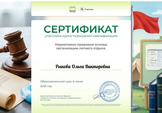 Сертификат "Нормативно-правовые основы организации летнего отдыха"